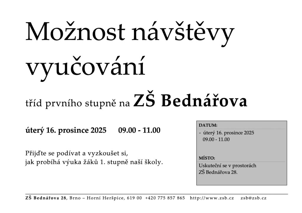 Budoucí prvňáčky a jejich rodiče zveme na Den otevřených dveří, který se bude konat v úterý 16. prosince 2025 v době od 9 do 11 hodin.